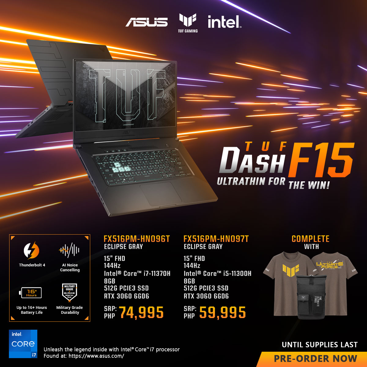 | TUF DASH F15 | FX516PM-HN096T | 15” FHD 144Hz, Intel® Core™ i7-11370H, 8GB RAM, 512GB PCIE3 SSD, NVIDIA® GeForce RTX™ 3060 6GB GDDR6 | 74,995 | TUF Gaming Backpack, TUF Exclusive Shirt |